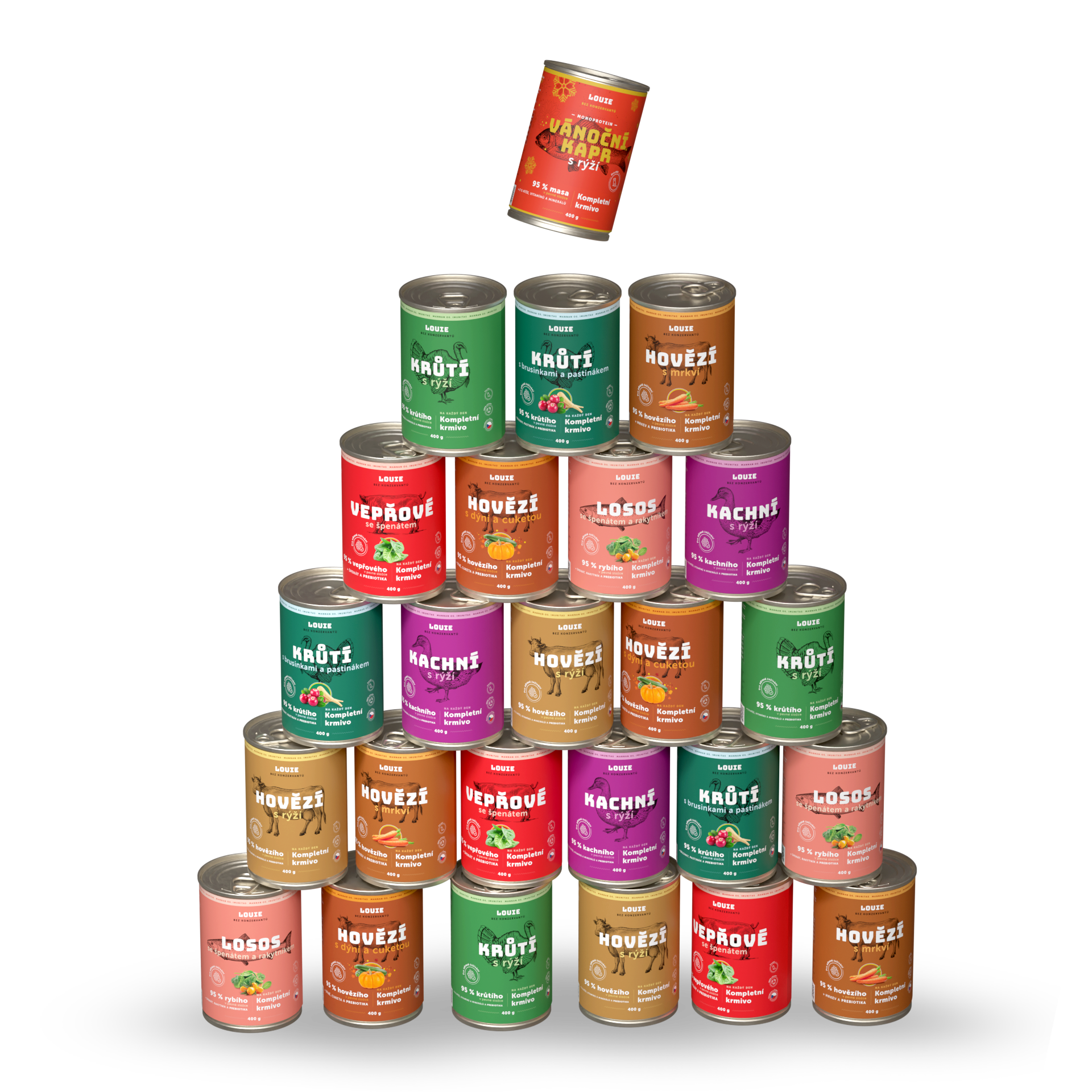 🎄 25 dní plných radosti – a kapor zadarmo! Urobte advent svojmu štvornohému parťákovi výnimočný!V balíčku nájdete 25 lahodných konzerv LOUIE bez kuracieho mäsa, starostlivo vybraných tak, aby každý deň voňal inak – od hovädzieho cez morčacie až po kačacie.A keďže Vianoce bez kapra by neboli Vianoce, pridali sme špeciálnu vianočnú príchuť „Vianočný kapor“ ako darček zadarmo! 🎁 Bez obilnín, bez zbytočností, s 95 % mäsa a poriadnou dávkou lásky.Ideálne ako adventný kalendár pre psích gurmánov alebo originálny vianočný darček.