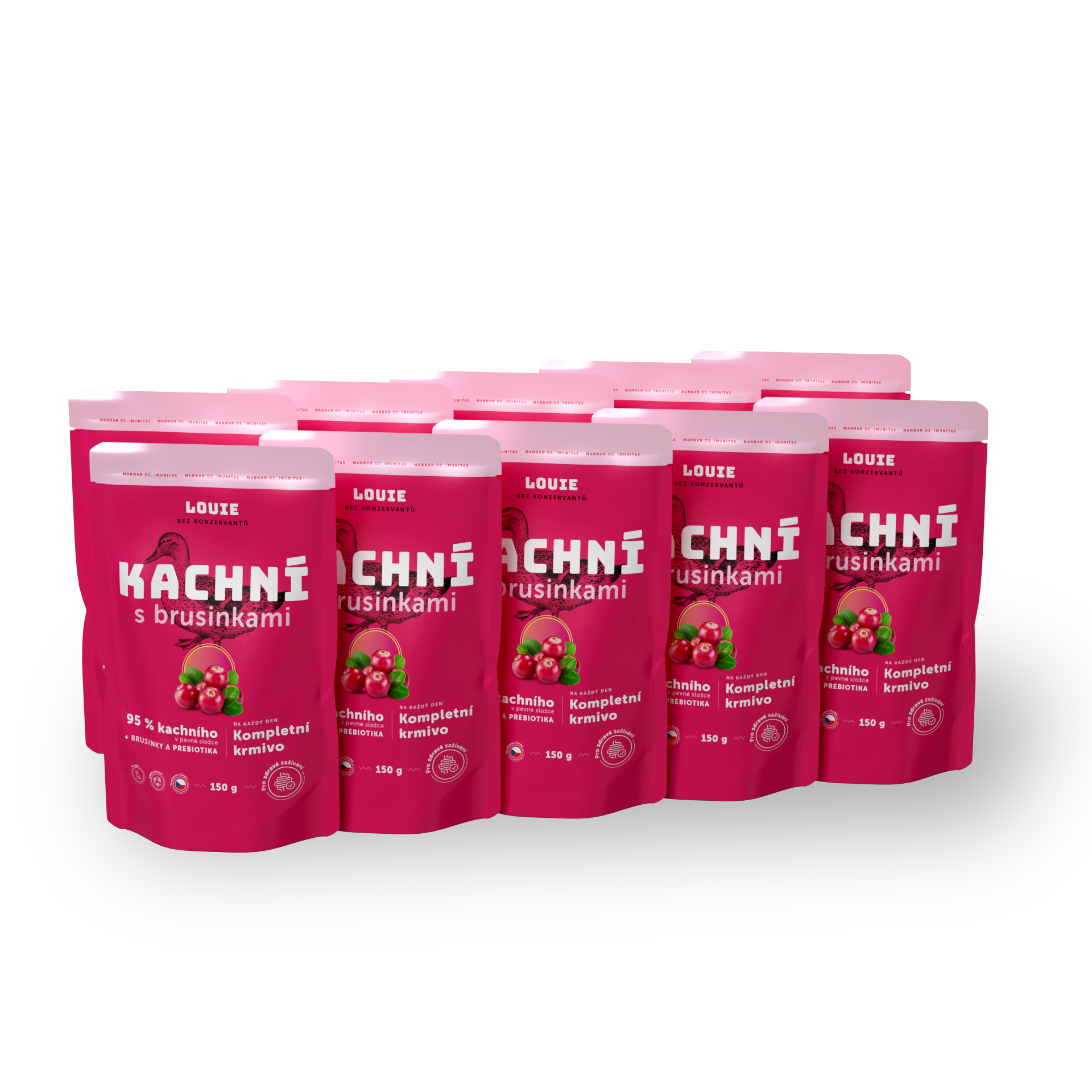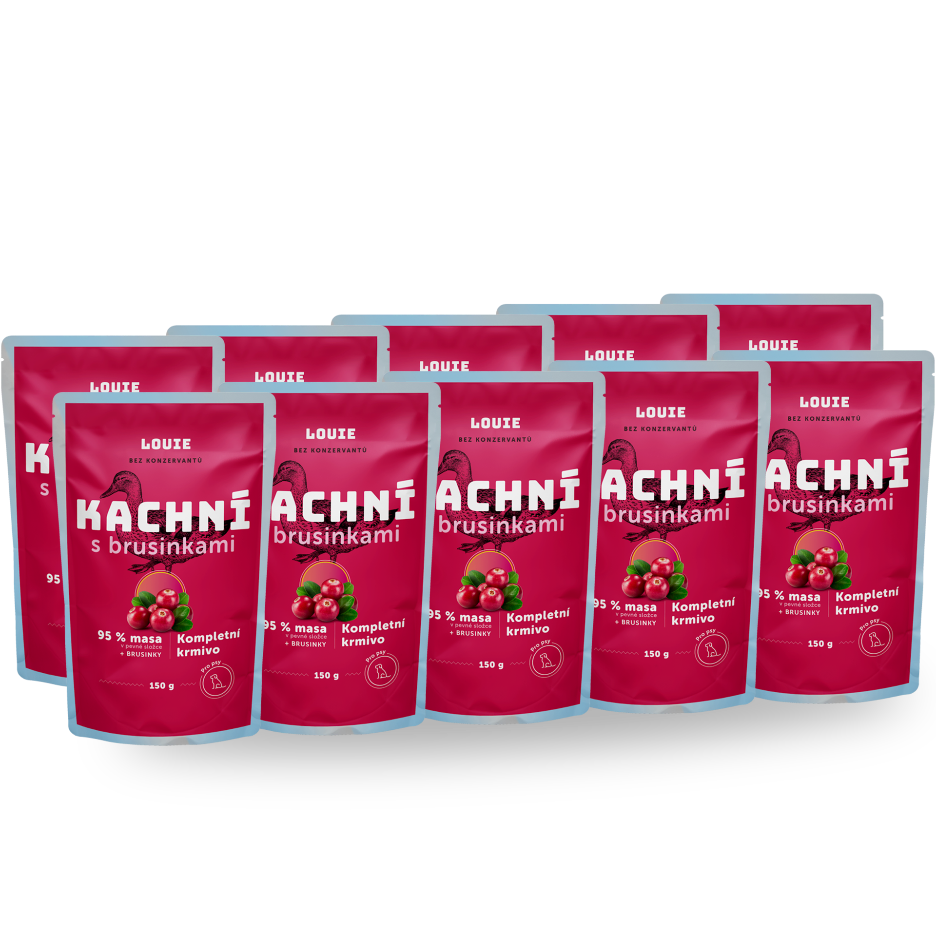 Praktická kapsička plné kompletního krmiva. Obsahuje 95% naozajstného kačacieho mäsa v pevnej zložke a 5% rastlinnej zložky, vitamínov a minerálov. Pridané brusnice udržiavajú zdravé močové sústavy a podporujú peristalitiku čriev. A po Louie zostane len vylízaná miska.