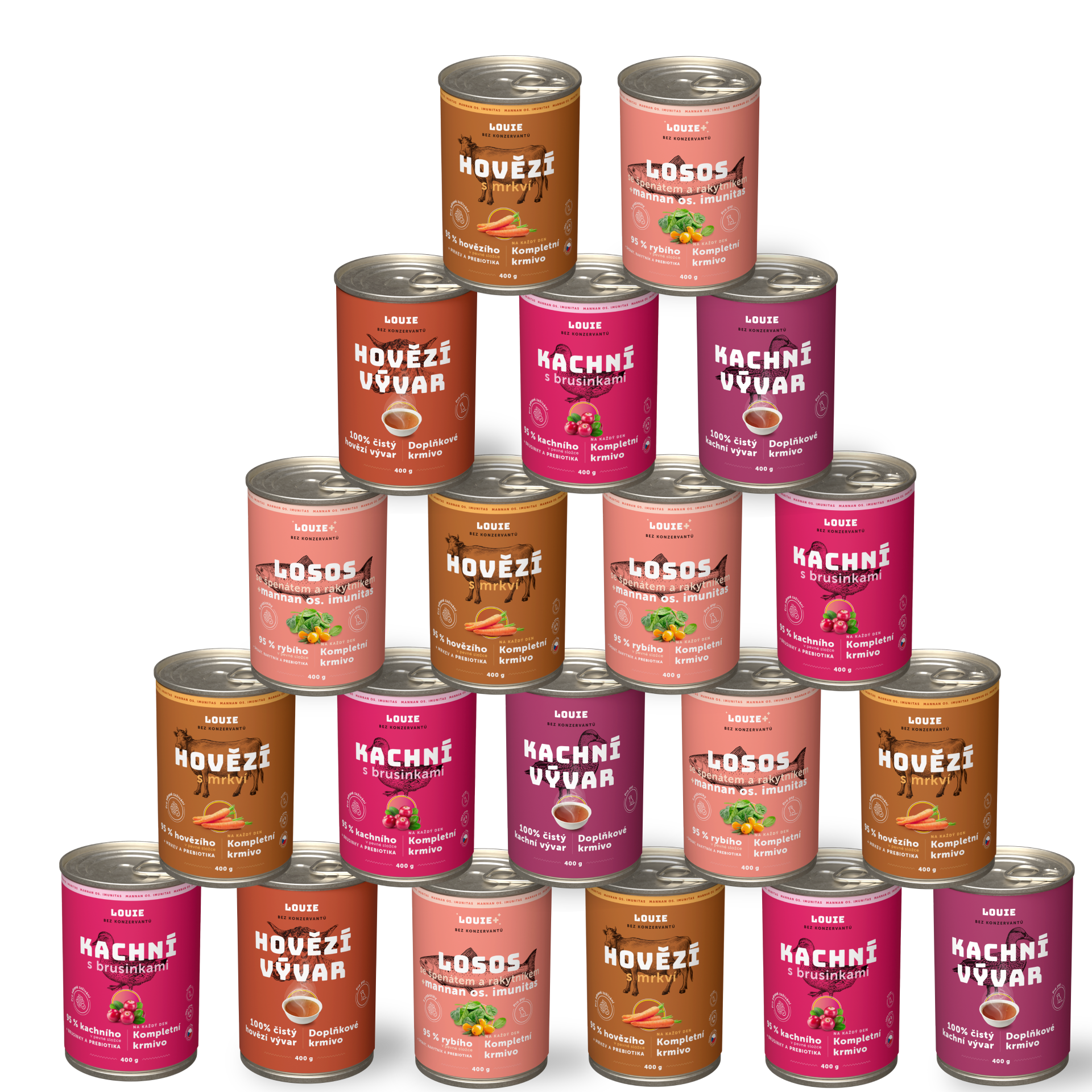 Áno, určite! LOUIE konzervy obsahujú všetko, čo tvoj chlpáč potrebuje pre zdravý a aktívny život. Obsahujú 95% mäsa v pevnej zložke a 5% rastlinnej zložky, vitamínov a minerálov. Neobsahujú žiadne konzervanty, dochucovadlá ani ďalšiu zbytočnú chémiu.