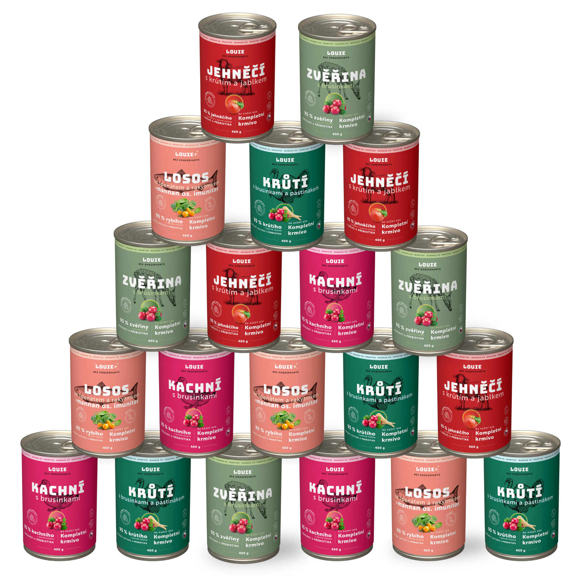 Ochutnávkový balíček obsahuje 20 konzerv. Každá konzerva má 95 % mäsa v pevnej zložke a je doplnená o vitamíny a minerály. Presné zloženie nájdeš vždy pri konkrétnom druhu v košíku.