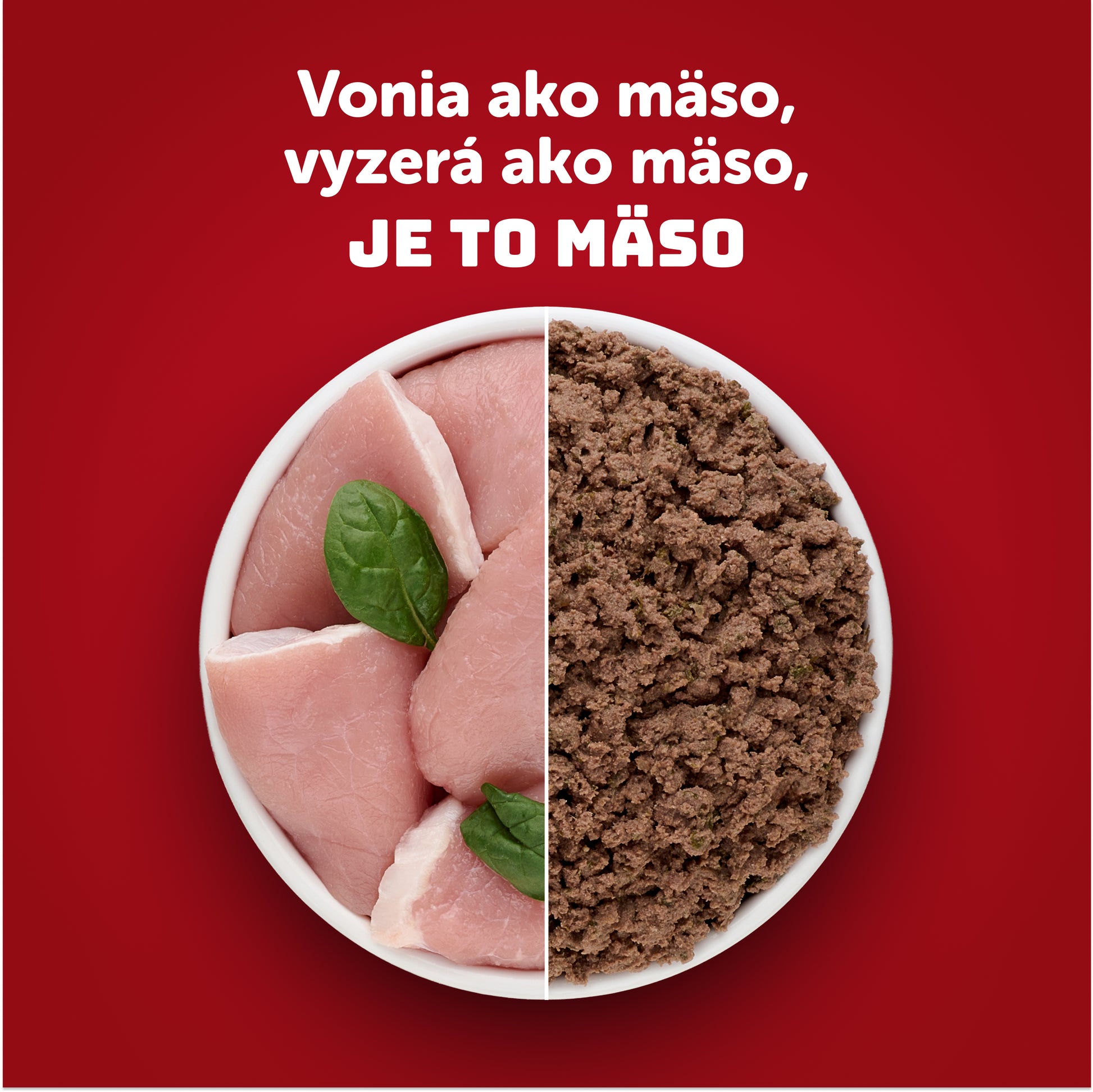 Kompletné krmivo bez nezmyslov s 95% bravčového mäsa v pevnej zložke. Nová receptúra má nielen množstvo mäsa, ale obsahuje aj prebiotiká zastúpené vo forme mannanoligosacharidov (MOS) a fruktooligosacharidov (FOS), ktoré posilňujú črevnú mikroflóru. Vláknina tiež prispieva k normálnej funkcii tráviaceho a imunitného systému a pridaný špenát dopĺňa potrebné živiny a vitamíny, takže tvoj psí parťák bude mať všetko, čo potrebuje pre zdravý a aktívny život.