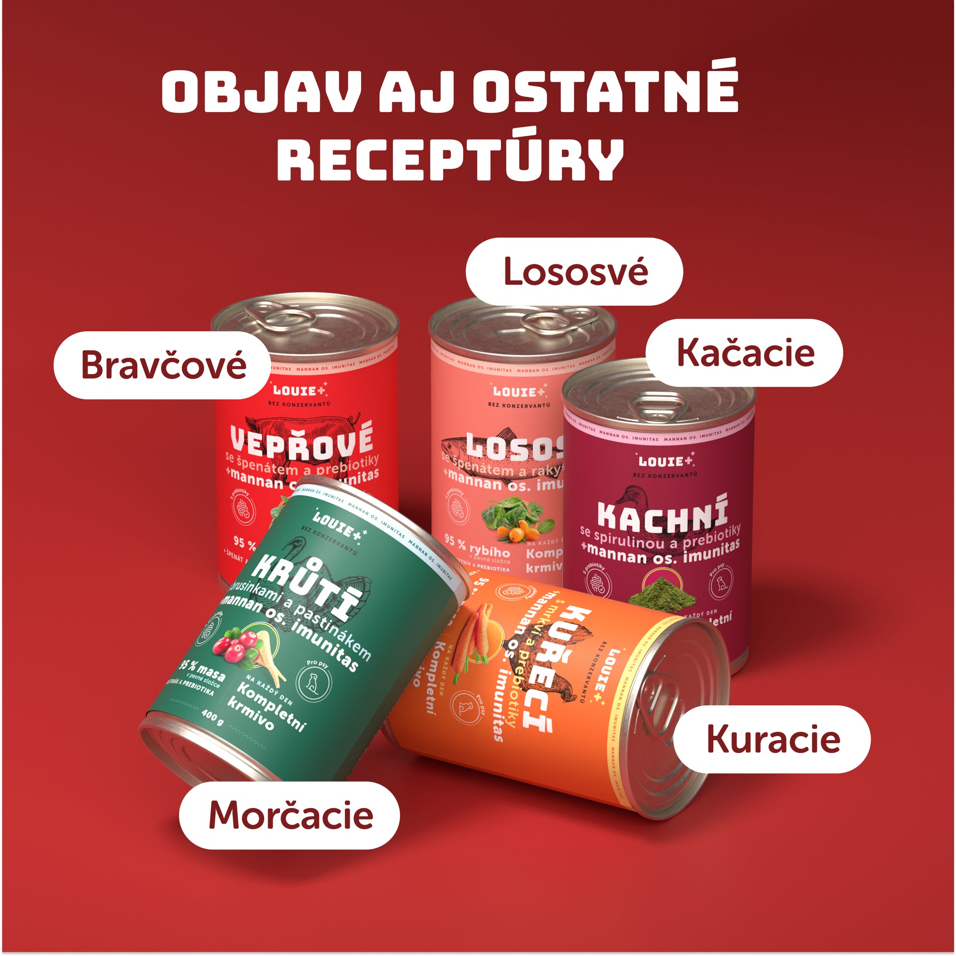 S LOUIE dávaš svojmu štvornožcovi všetko, čo potrebuje – 95 % mäsa v pevnej zložke, trochu rastlinných zložiek a plnú dávku živín. A tá vôňa? Neodolateľná!