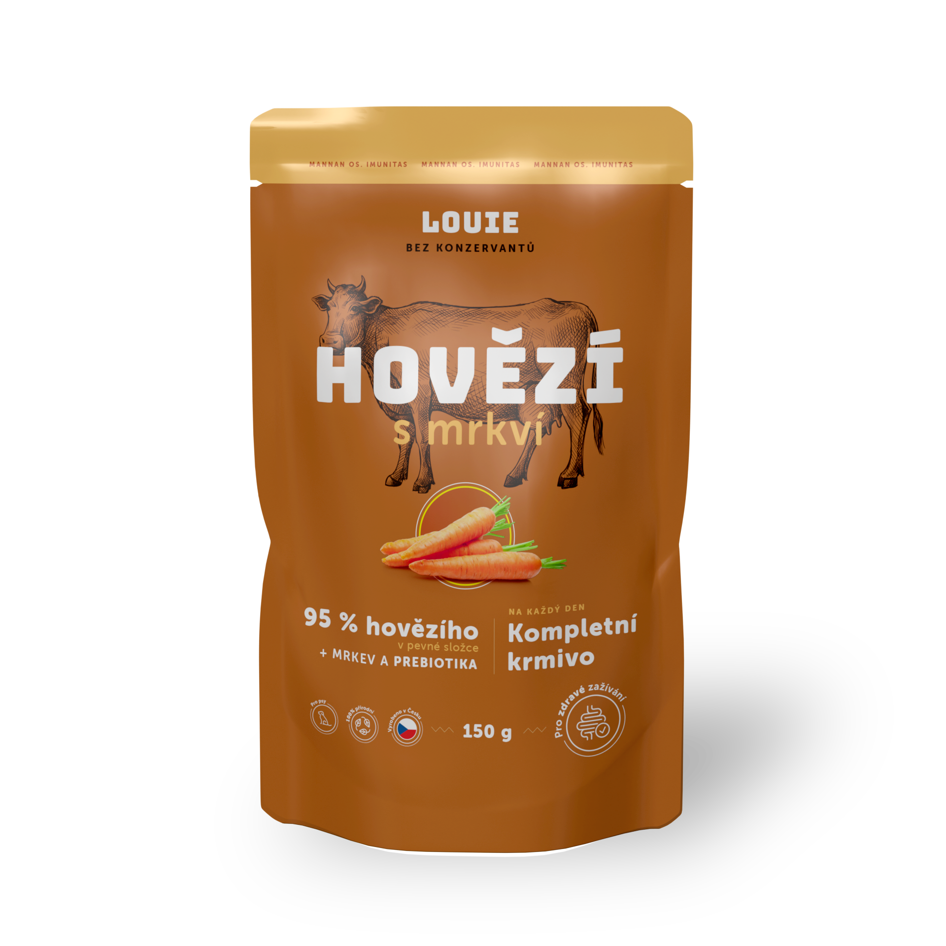 Balenie praktických kapsičiek plné kompletního krmiva. Obsahuje 95% naozajstného hovädzieho mäsa v pevnej zložke a 5% rastlinnej zložky, vitamínov a minerálov Pridaná mrkva dodáva psom potrebné živiny a minerály, takže tvoj psí parťák bude mať všetko,čo potrebuje pre zdravý a aktívny život.