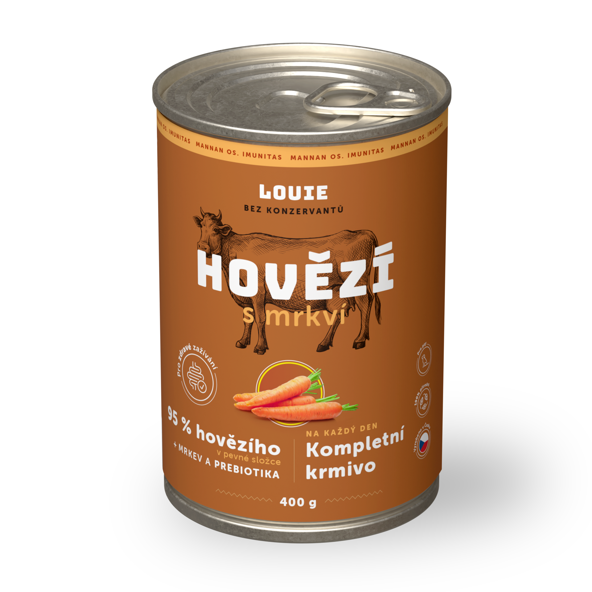 Kompletné krmivo bez nezmyslov. Šťavnaté konzervy obsahujú 95% mletého hovädzieho mäsa v pevnej zložke a 5 % rastlinnej zložky, vitamínov a minerálov. Obsiahnutá mrkva dodáva psom potrebné živiny a minerály. A po Louie zostane len vylízaná miska.