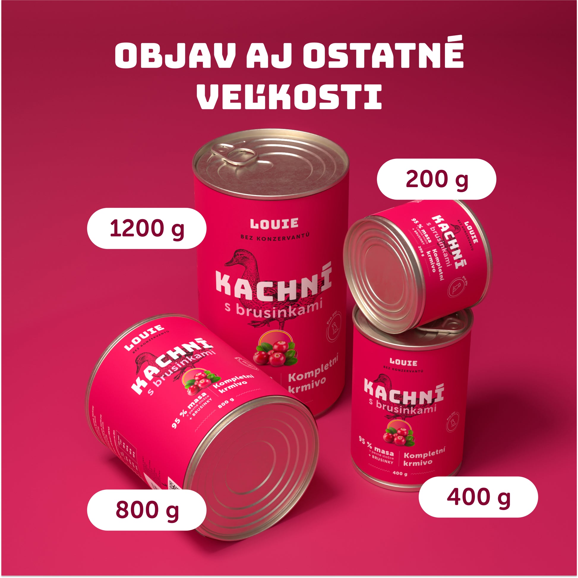 Praktická kapsička plné kompletního krmiva. Obsahuje 95% naozajstného kačacieho mäsa v pevnej zložke a 5% rastlinnej zložky, vitamínov a minerálov Pridané brusnice udržiavajú zdravé močové sústavy a podporujú peristalitiku čriev. A po Louie zostane len vylízaná miska.