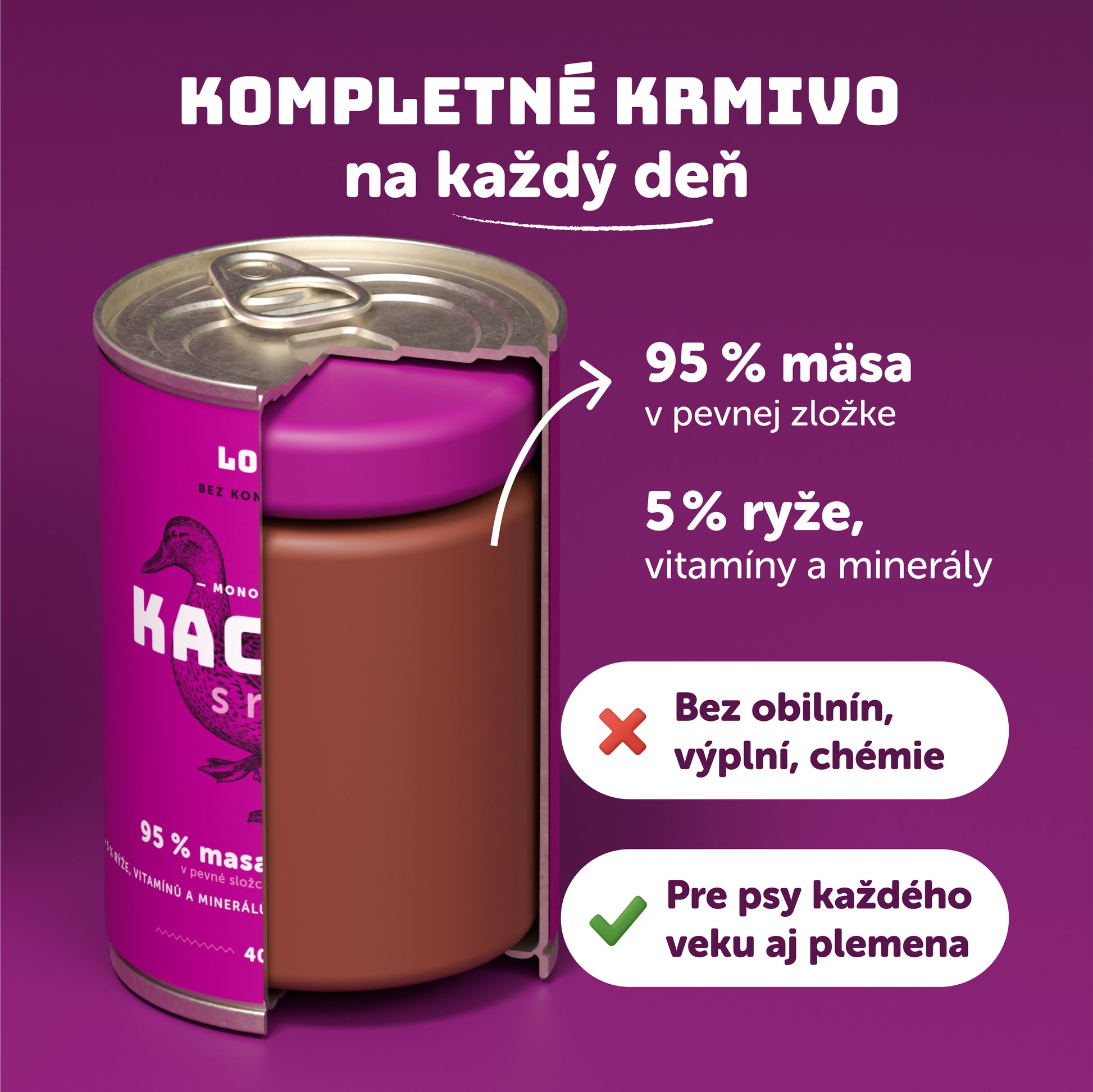 🐶 Pre psov každého veku aj plemena ❌ Bez konzervantov 🥩 95 % mäsa v pevnej zložke Kompletné krmivo 100 % prírodné Vyrobené v Česku
