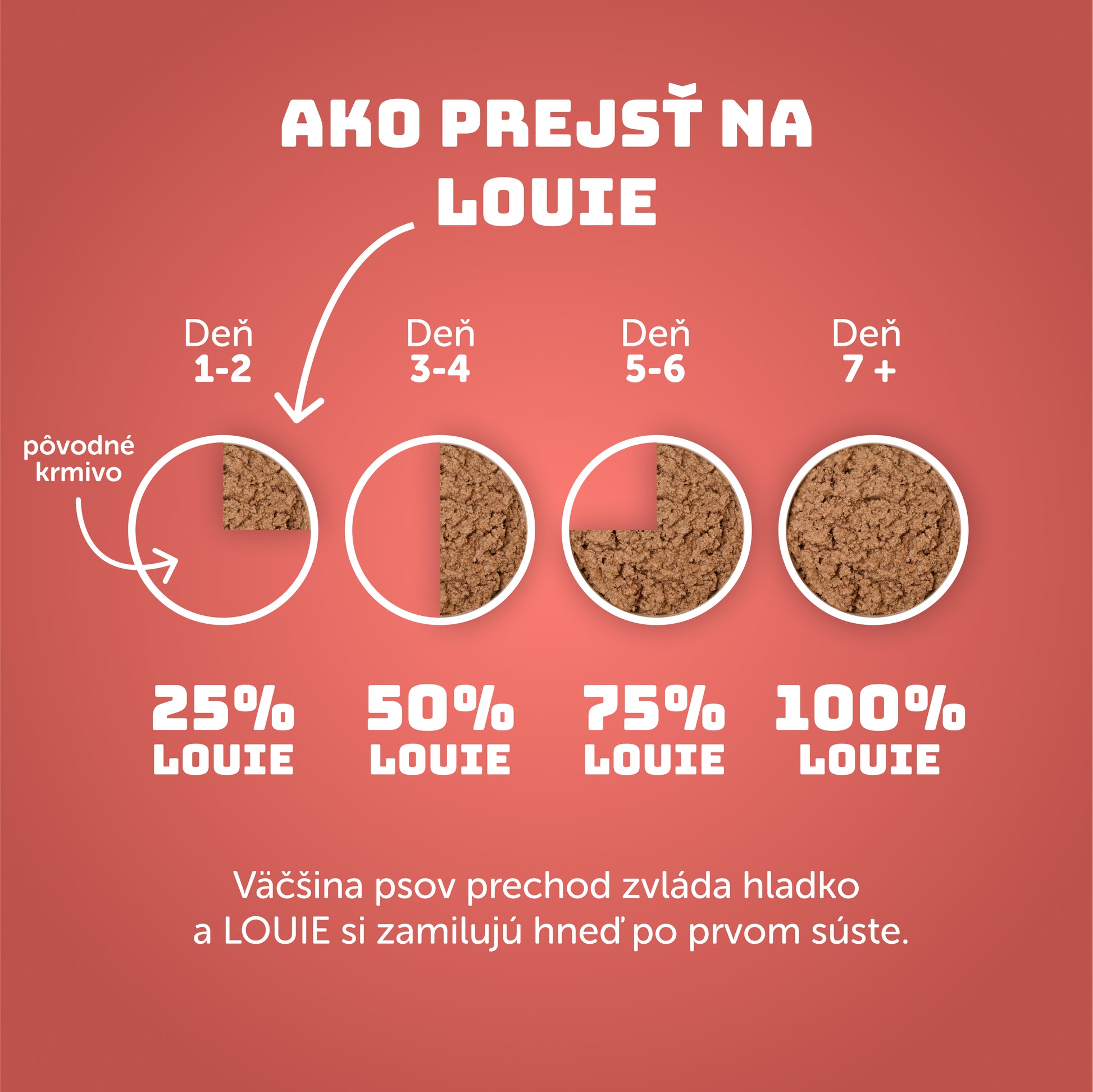 S LOUIE dávaš svojmu štvornožcovi všetko, čo potrebuje – 95 % mäsa v pevnej zložke, trochu rastlinných zložiek a plnú dávku živín. A tá vôňa? Neodolateľná!