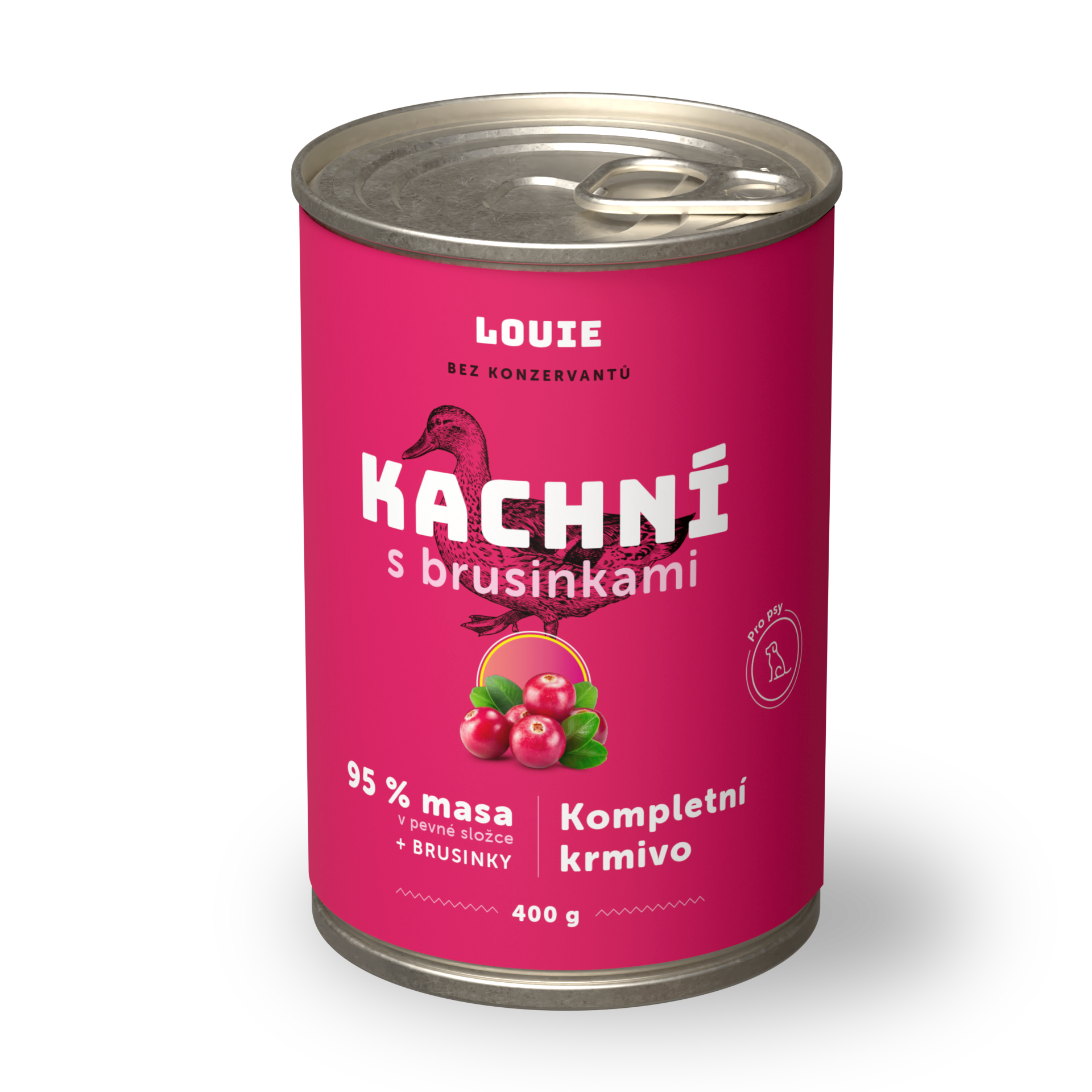 Kompletné krmivo bez nezmyslov. 95% kačacieho mäsa v pevnej zložke a 5% rastlinnej zložky, vitamínov a minerálov Obsiahnuté brusnice pomáhajú udržiavať zdravý močový systém a podporujú peristaltiku čriev. A po Louie zostane len vylízaná miska.
