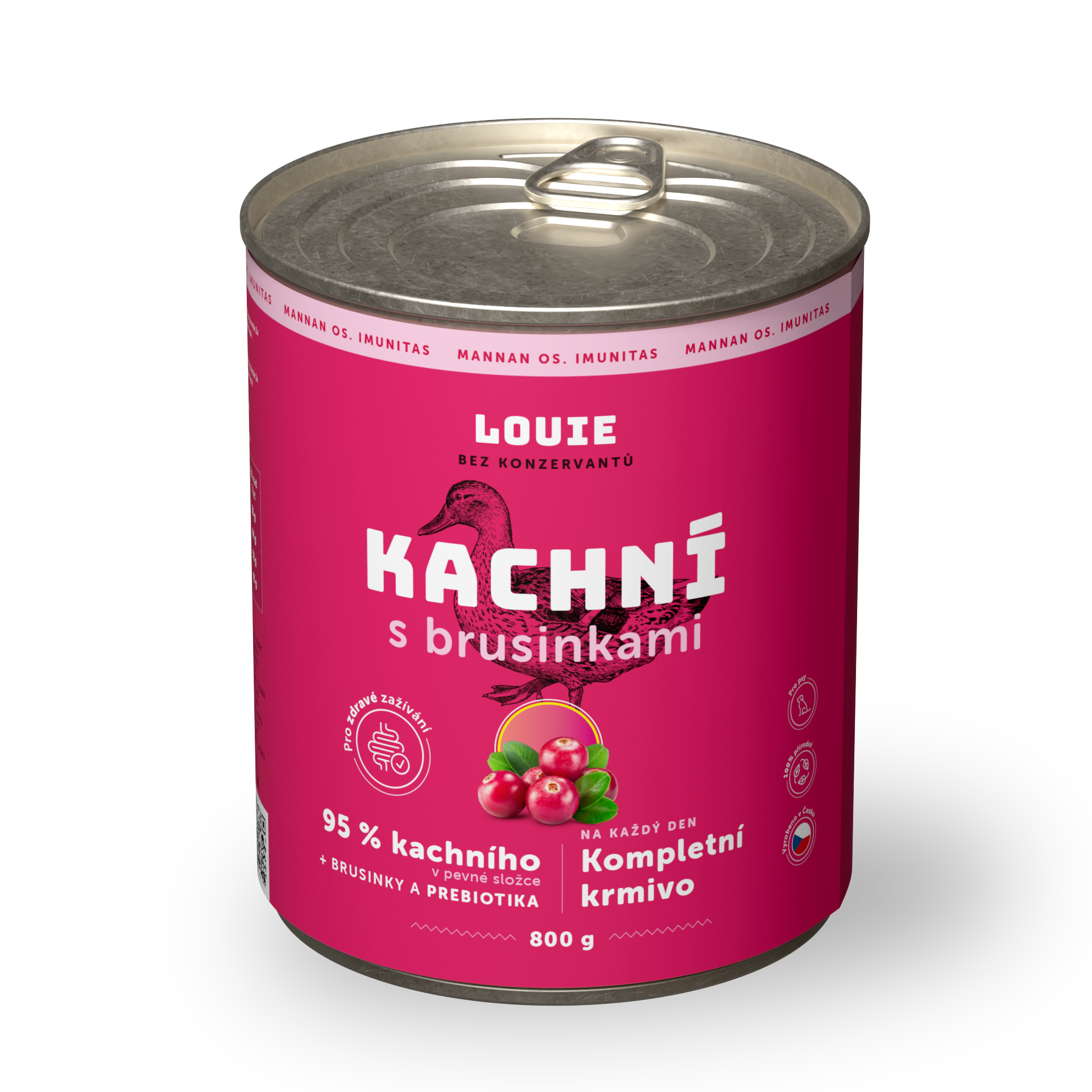 Kompletné krmivo bez nezmyslov. 95% kačacieho mäsa v pevnej zložke a 5% rastlinnej zložky, vitamínov a minerálov Obsiahnuté brusnice pomáhajú udržiavať zdravý močový systém a podporujú peristaltiku čriev. A po Louie zostane len vylízaná miska.