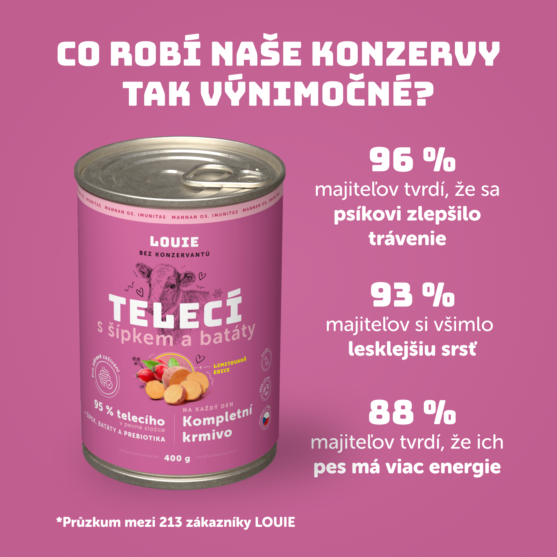 Áno, určite! LOUIE konzervy obsahujú všetko, čo tvoj chlpáč potrebuje pre zdravý a aktívny život. Obsahujú 95% mäsa v pevnej zložke a 5% rastlinnej zložky, vitamínov a minerálov. Neobsahujú žiadne konzervanty, dochucovadlá ani ďalšiu zbytočnú chémiu.