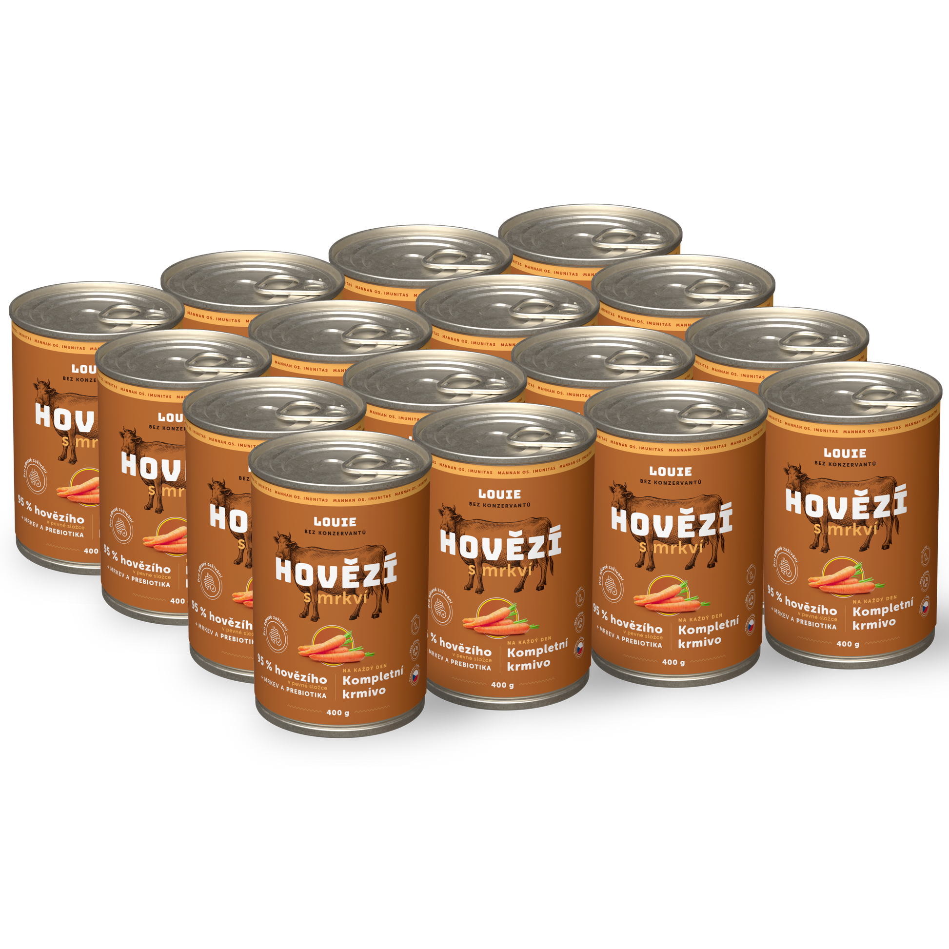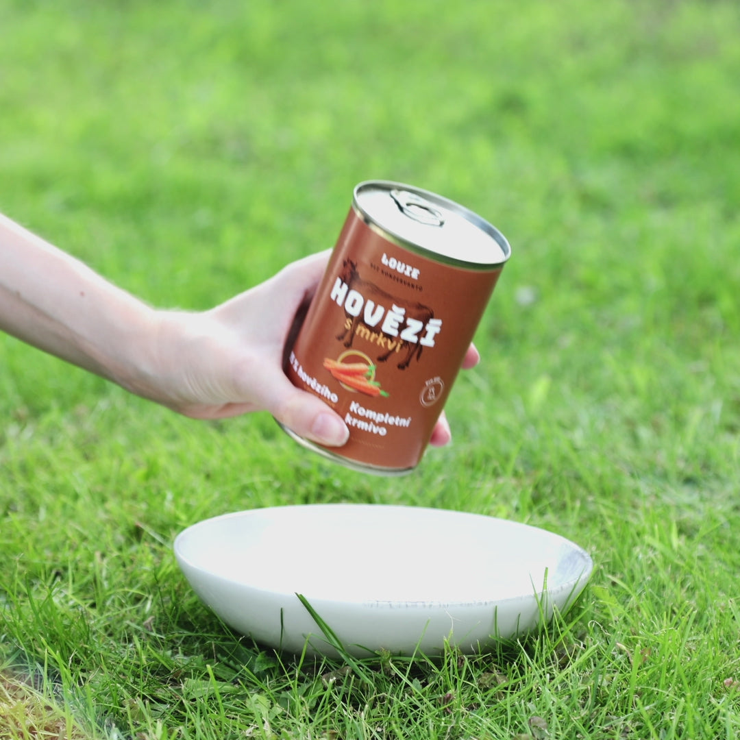 Kompletné krmivo bez nezmyslov. Šťavnaté konzervy obsahujú 95% mletého hovädzieho mäsa v pevnej zložke a 5 % rastlinnej zložky, vitamínov a minerálov. Obsiahnutá mrkva dodáva psom potrebné živiny a minerály. A po Louie zostane len vylízaná miska.