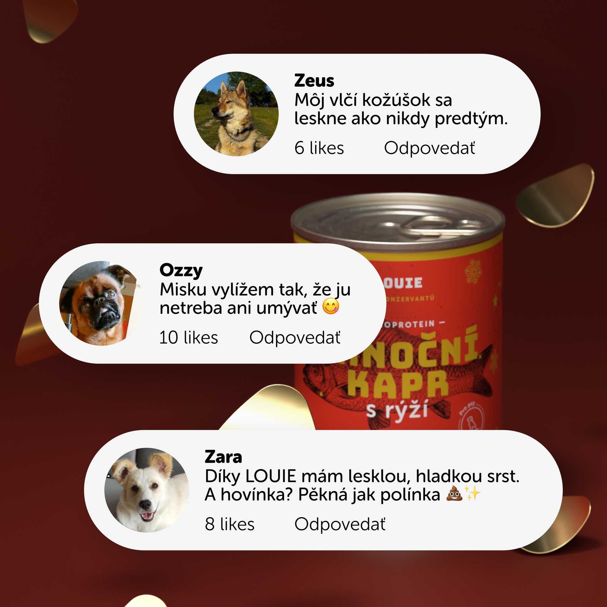 Vianočný kapor od LOUIE je limitovaná edícia plná sviatočnej atmosféry. Jemné mäso z kapra doplnené o ryžu poteší aj tých najväčších psích gurmánov. Ľahko stráviteľné, bohaté na omega-3 mastné kyseliny a bez zbytočností. Dokonalá vianočná hostina pre štvornohých členov rodiny.