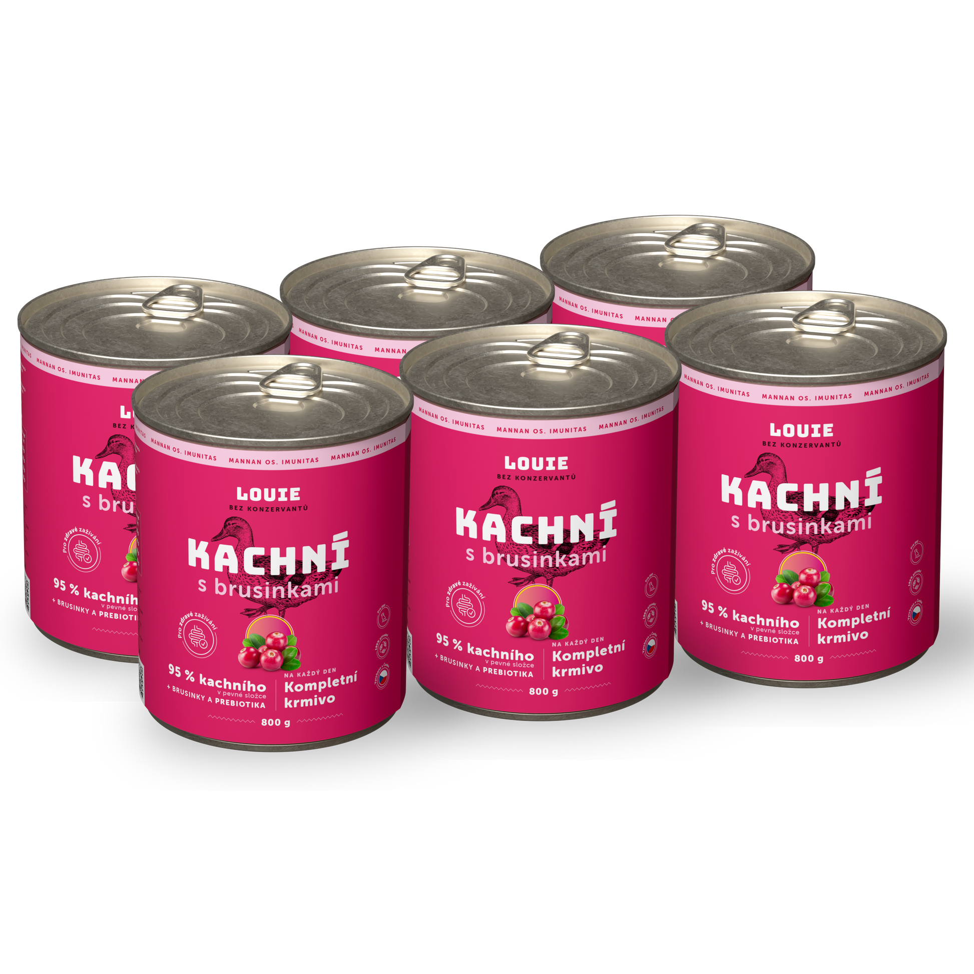Kompletné krmivo bez nezmyslov. 95% kačacieho mäsa v pevnej zložke a 5% rastlinnej zložky, vitamínov a minerálov. Obsiahnuté brusnice pomáhajú udržiavať zdravý močový systém a podporujú peristaltiku čriev. A po Louie zostane len vylízaná miska.