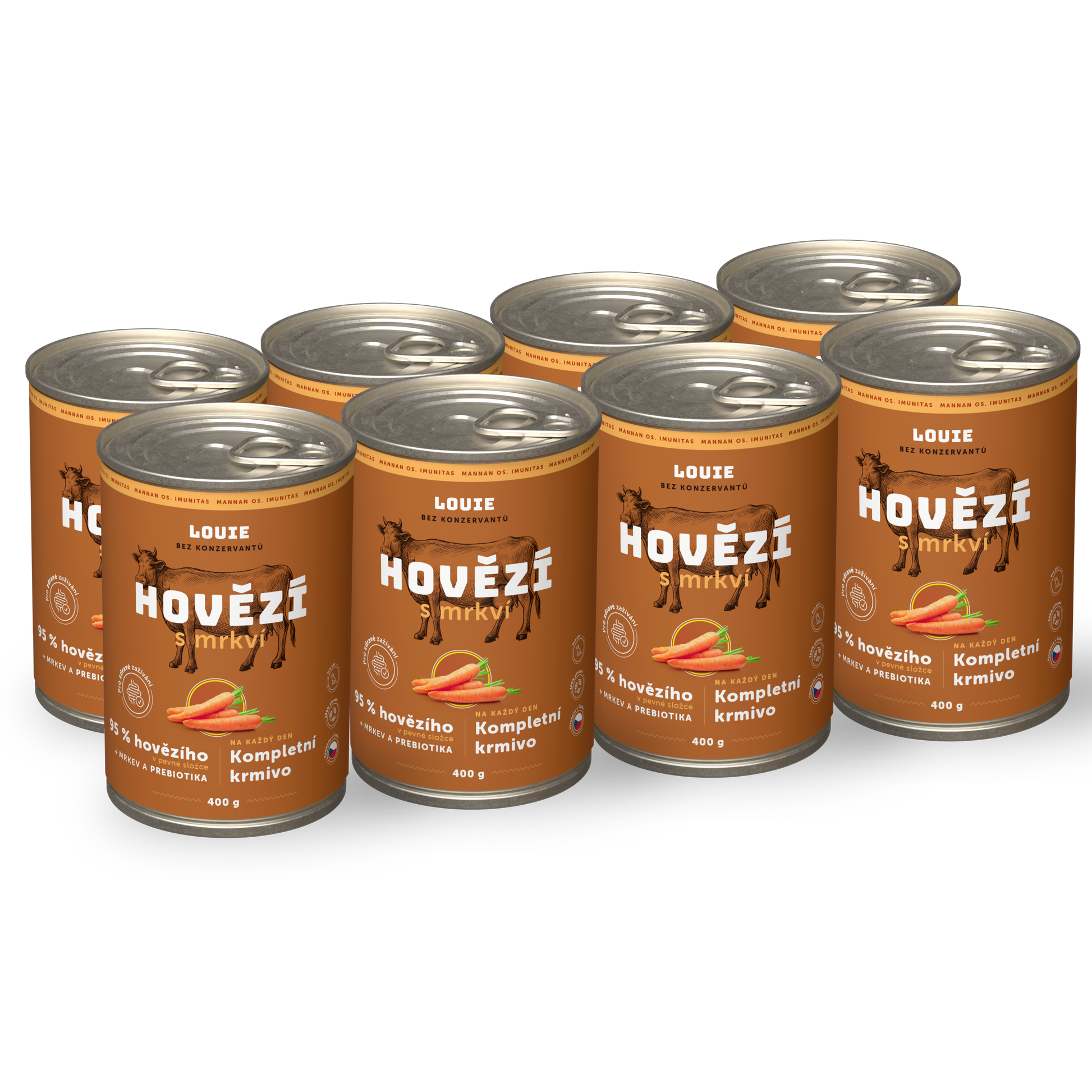 Kompletné krmivo bez nezmyslov. Šťavnaté konzervy obsahujú 95% mletého hovädzieho mäsa v pevnej zložke a 5 % rastlinnej zložky, vitamínov a minerálov. Obsiahnutá mrkva dodáva psom potrebné živiny a minerály. A po Louie zostane len vylízaná miska.