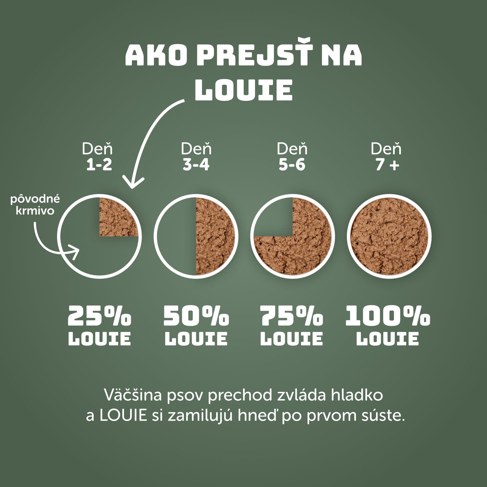 Zloženie konzerv LOUIE zažívacím problémom predchádza, napriek tomu je ale každý psík jedinečný a môže sa u neho hnačka objaviť. Ak je zvyknutý hlavne na suché krmivo, odporúčame konzervu počas prvých dní až týždňov miešať s granulami na ktoré je zvyknutý. Podiel konzervy potom môžete postupne zvyšovať. Hnačka môže byť prirodzenou reakciou na zmenu stravy, najmä ak bol pes dlhodobo kŕmený prevažne granulami. Tie síce predstavujú pohodlné riešenie pre majiteľov, ale pre psa nie sú úplne prirodzené.
