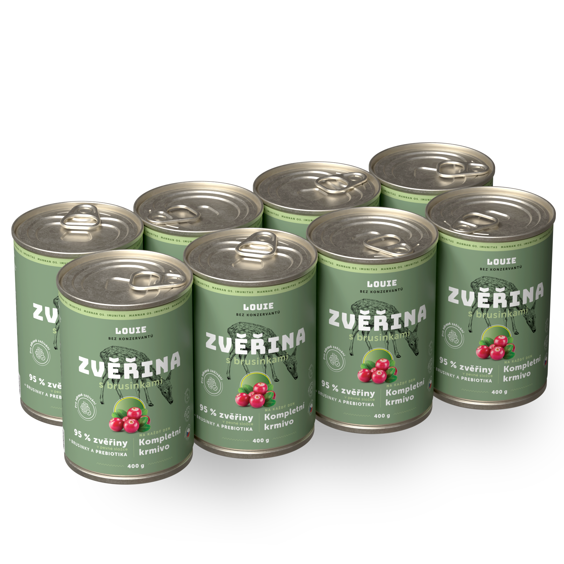 Voňavá zverina s brusnicami poteší aj tých najväčších psích gurmánov. Jemné mäso zo zveriny je plné kvalitných bielkovín a železa, ktoré podporujú silné svaly a vitalitu. Brusnice dodávajú dávku antioxidantov a prispievajú k zdravým močovým cestám. Konzerva je bez obilnín, farbív a dochucovadiel – len poctivé mäso, vývar a štipka lásky z Česka.