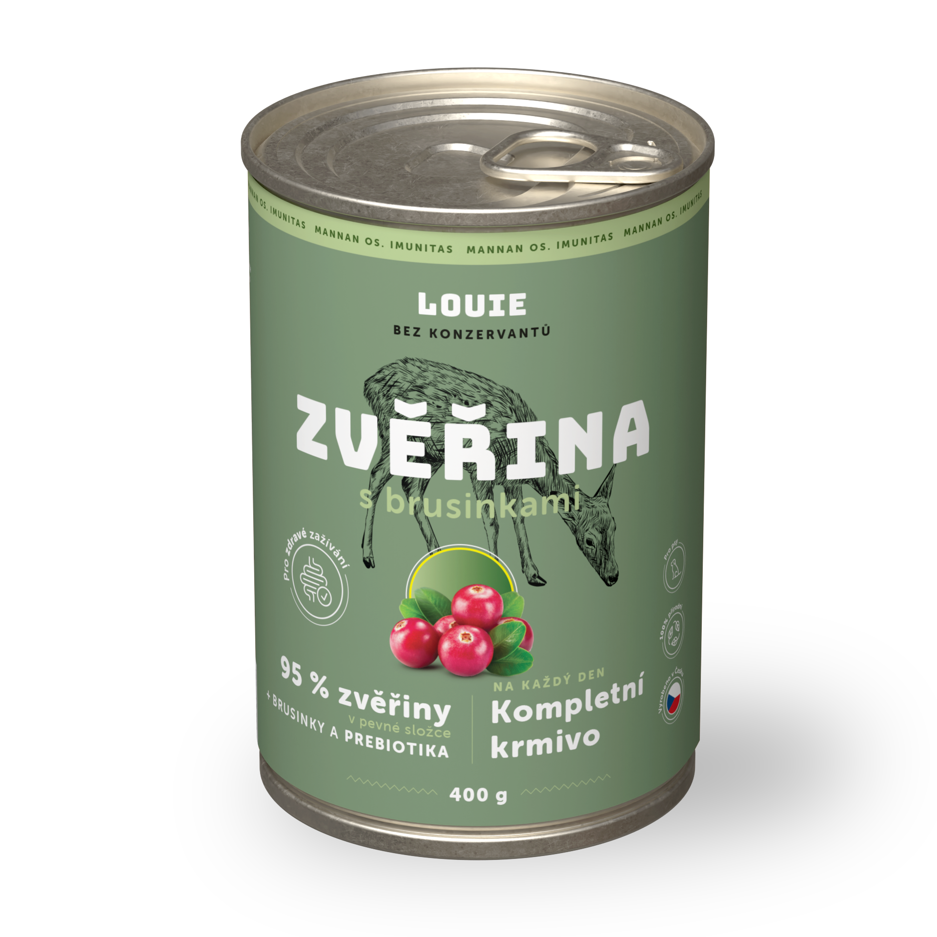 Voňavá zverina s brusnicami poteší aj tých najväčších psích gurmánov. Jemné mäso zo zveriny je plné kvalitných bielkovín a železa, ktoré podporujú silné svaly a vitalitu. Brusnice dodávajú dávku antioxidantov a prispievajú k zdravým močovým cestám. Konzerva je bez obilnín, farbív a dochucovadiel – len poctivé mäso, vývar a štipka lásky z Česka.